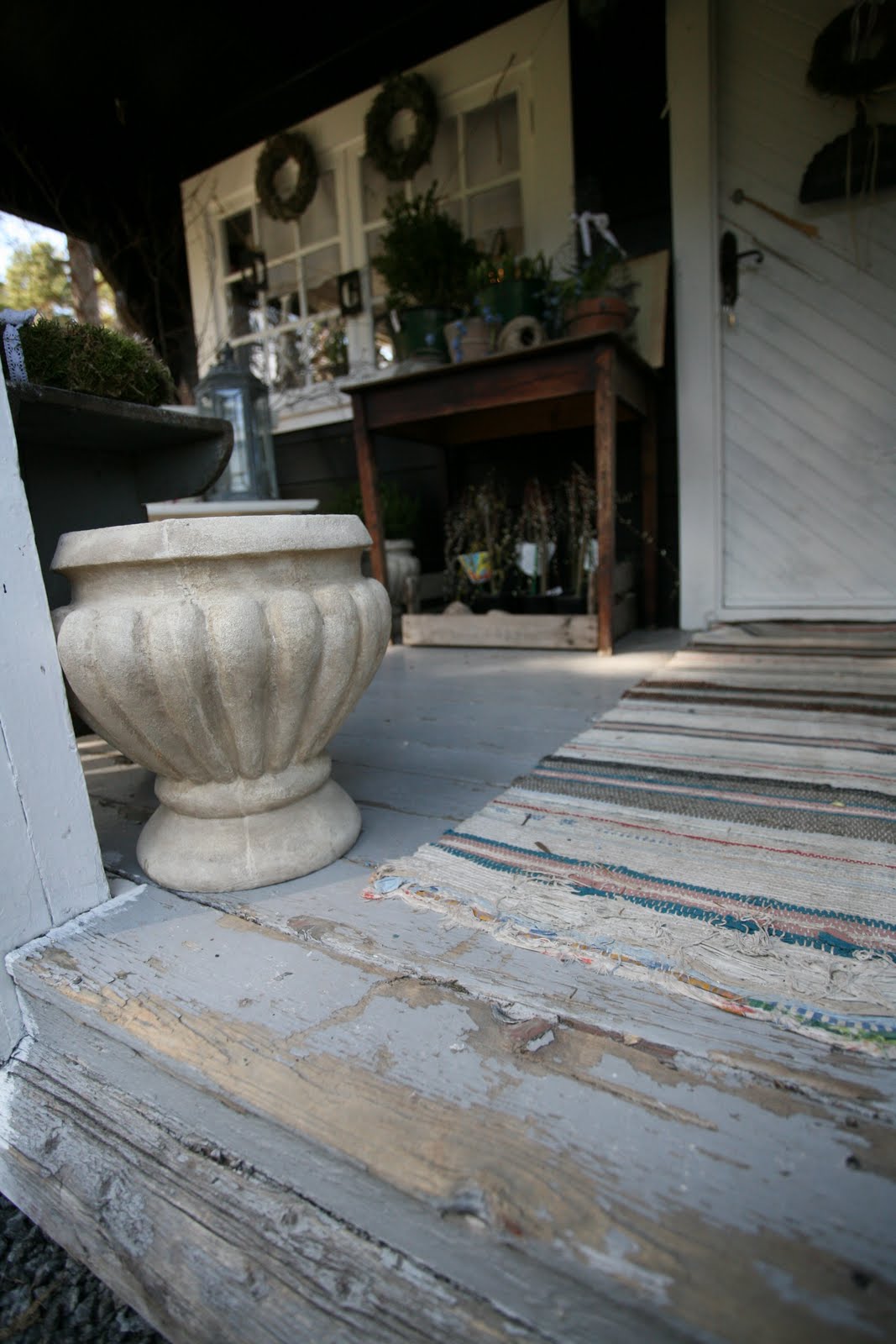 Her ser dere mitt vakre gamle gulv på terrassen utenfor butikken. Har også fått tak i ei gammel rye som jeg synes passet godt.